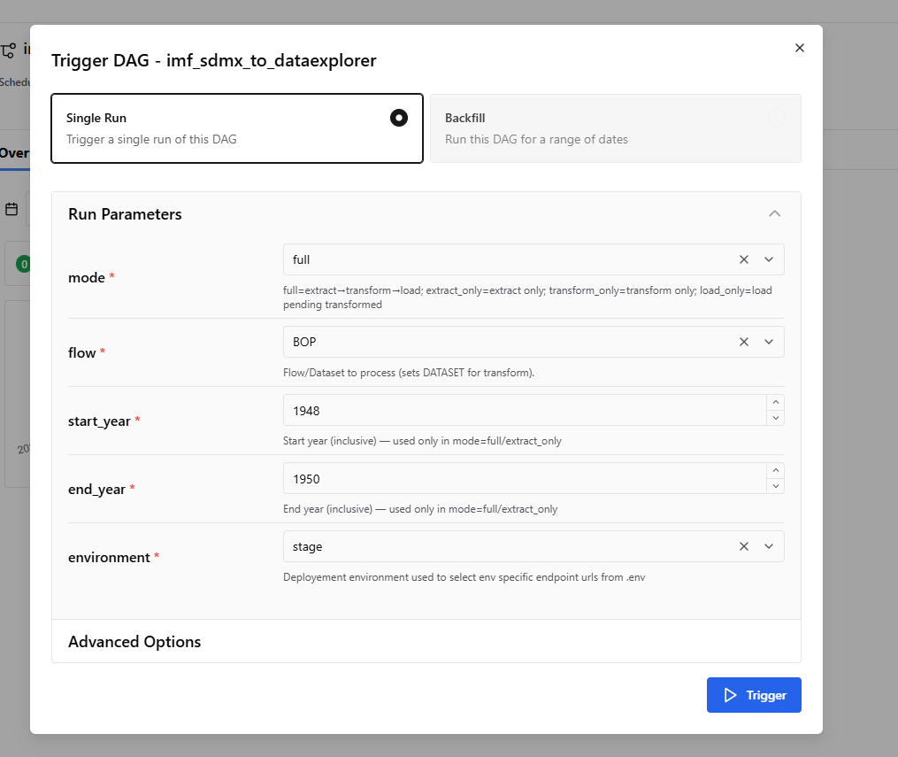 Figure 1: orchestration platform at runtime showing the options available for selection before running the pipeline.