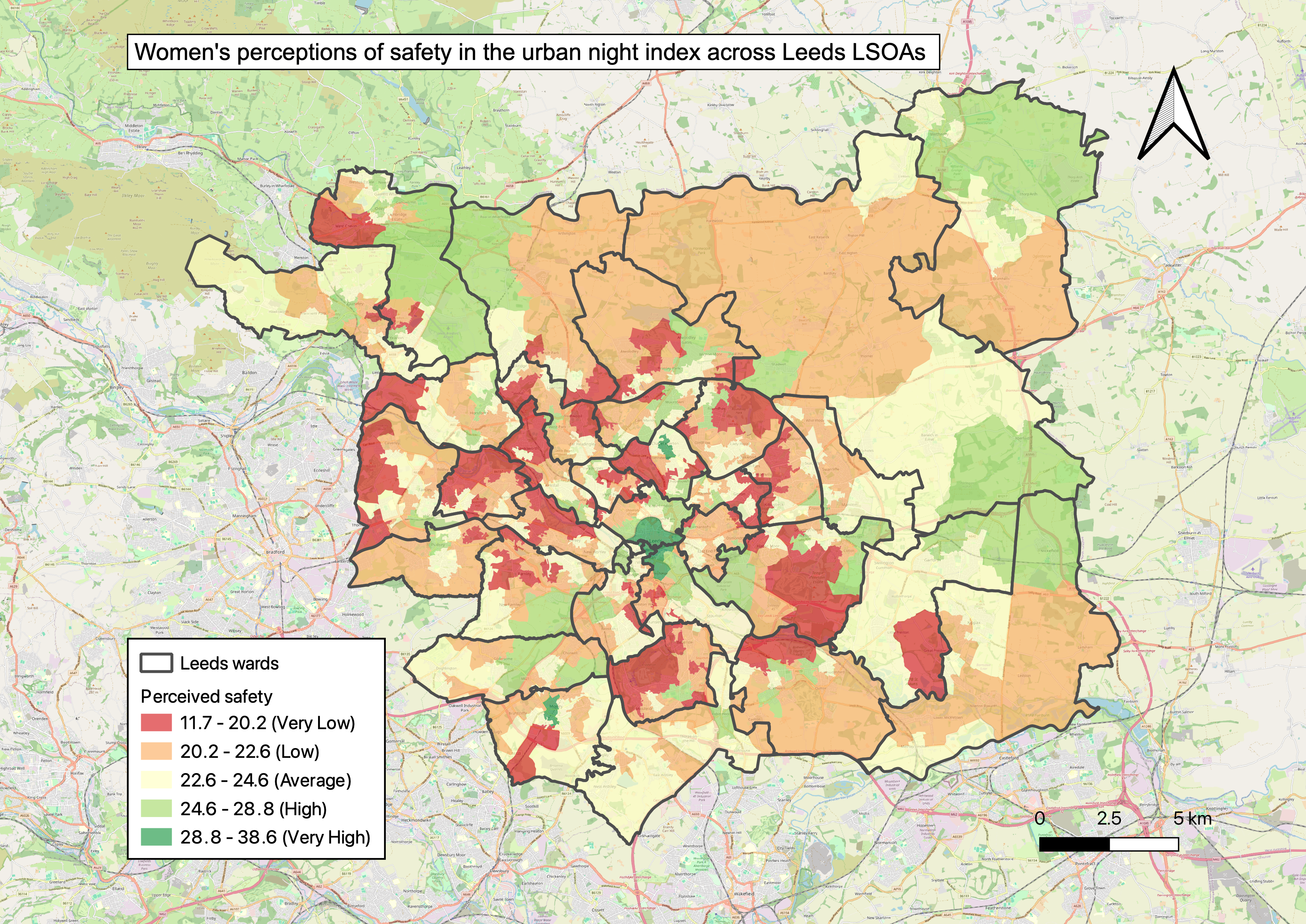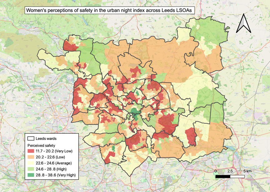 The finalised index, the Women’s Perceived Safety at Night Index (WPSNI), categorised neighbourhoods in Leeds on a very high to very low perceived safety scale.